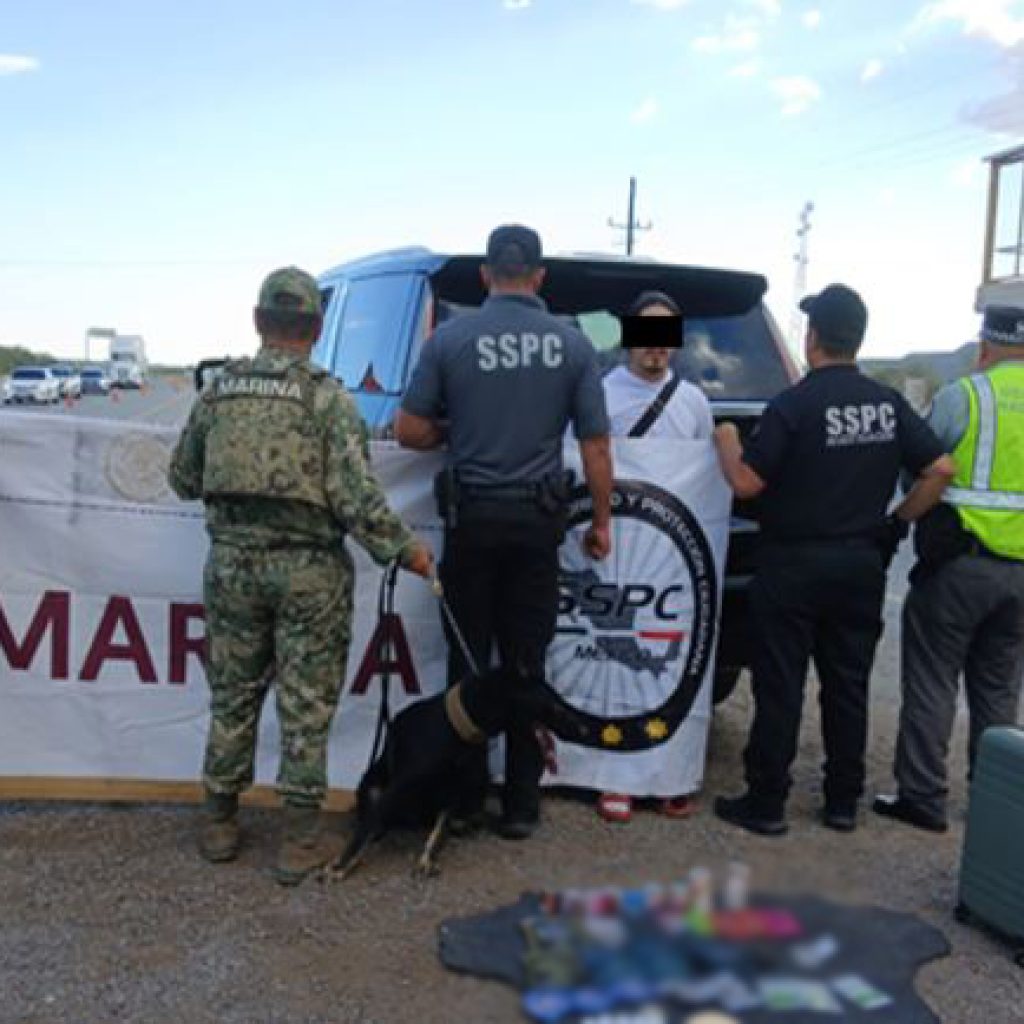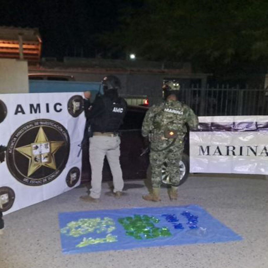 En Caborca, Sonora, se aseguró un vehículo, 103 envoltorios con metanfetamina, 30 envoltorios con marihuana y 50 envoltorios con cocaína. En distintos municipios de la entidad, se detuvo a cinco personas, se aseguraron 105 envoltorios con marihuana, 14 dosis de metanfetamina, un vehículo y dinero en efectivo.