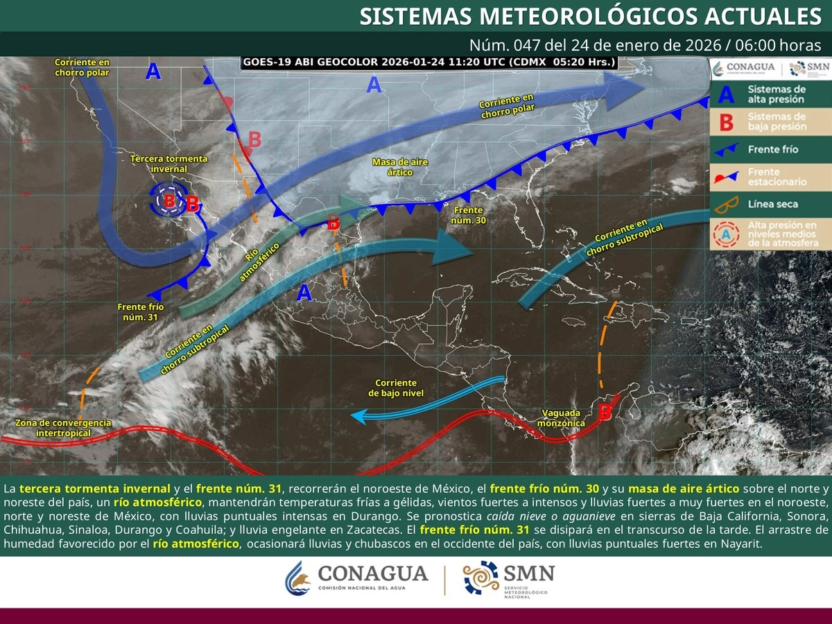La tercera tormenta invernal de la temporada se desplazará sobre el noroeste de México, mientras el frente frío número 30 y su masa de aire ártico ocasionarán lluvias intensas en Chihuahua y Durango; muy fuertes en Sonora, Sinaloa y Nayarit, y fuertes en Baja California Sur, Coahuila y Zacatecas.