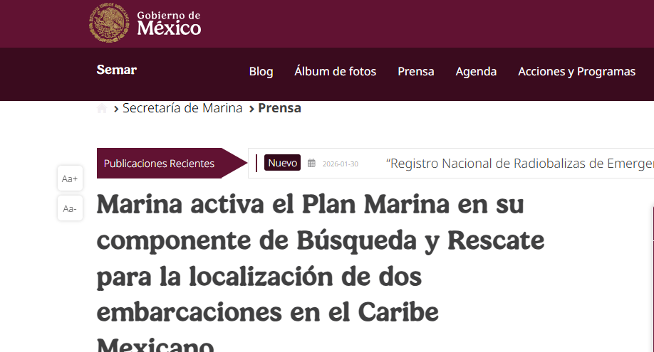 Ante la falta de comunicación, la Armada de México desplegó un operativo de gran escala que incluye aeronaves de exploración técnica tipo Persuader y unidades de superficie para peinar el área marítima. Los Mandos Navales en Isla Mujeres y Yucalpetén han emitido avisos de emergencia a toda la comunidad marítima, incluyendo buques comerciales y pesqueros que navegan por el Caribe y el Golfo de México.