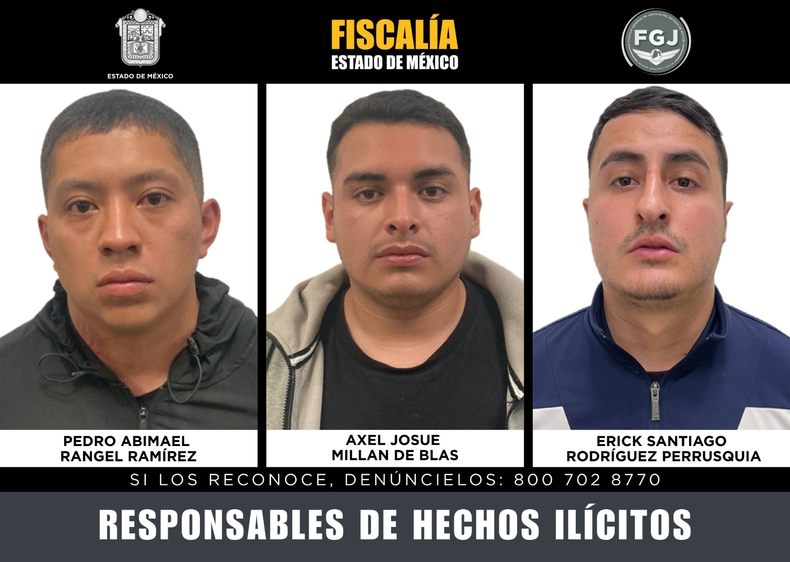 Tras proceso legal y con la información y las evidencias recabadas y aportadas por la Fiscalía mexiquense, una Autoridad Judicial determinó la participación de Axel Josué Millán de Blas, Erick Santiago Rodríguez Perrusquia y Pedro Abimael Rangel Ramírez, en el delito de secuestro exprés con fines de robo.