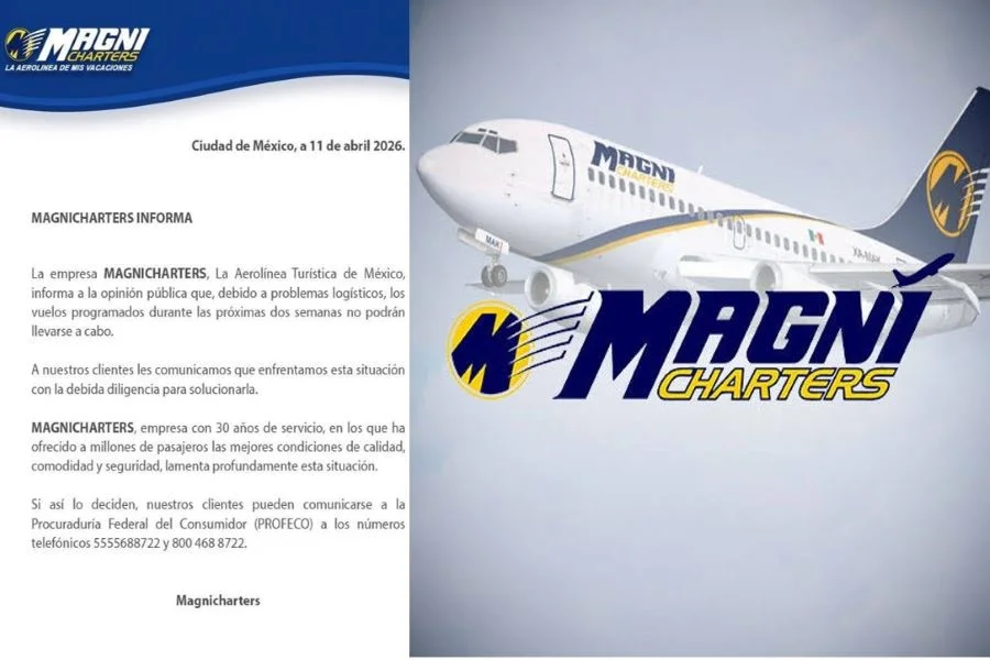 Ciudad de México. — La Secretaría de Infraestructura, Comunicaciones y Transportes (SICT), a través de la Agencia Federal de Aviación Civil (AFAC), emitió una nota informativa la madrugada de este domingo tras el anuncio de suspensión temporal de actividades de Grupo Aéreo Monterrey, S.A. de C.V. (Magnicharters). La aerolínea informó que, debido a problemas logísticos, no podrá cumplir con sus vuelos programados durante las próximas dos semanas.