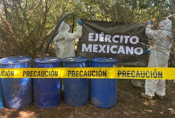 También en Culiacán se localizó un área de concentración de material diverso para la elaboración de drogas sintéticas donde se aseguraron 13,850 litros de sustancias químicas. La afectación económica a la delincuencia organizada es de 281 millones de pesos.