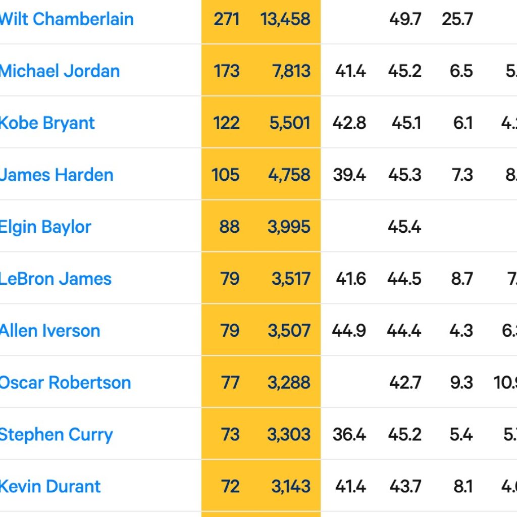La lista de los máximos anotadores en esta categoría es un auténtico «quién es quién» de la grandeza de la NBA. Lejos en la cima están Chamberlain, Michael Jordan (173) y Kobe Bryant (122). No obstante, el ascenso de Curry, superando a un jugador del calibre de Kevin Durant (quien ahora queda en décimo lugar), reafirma su legado como un competidor de época.