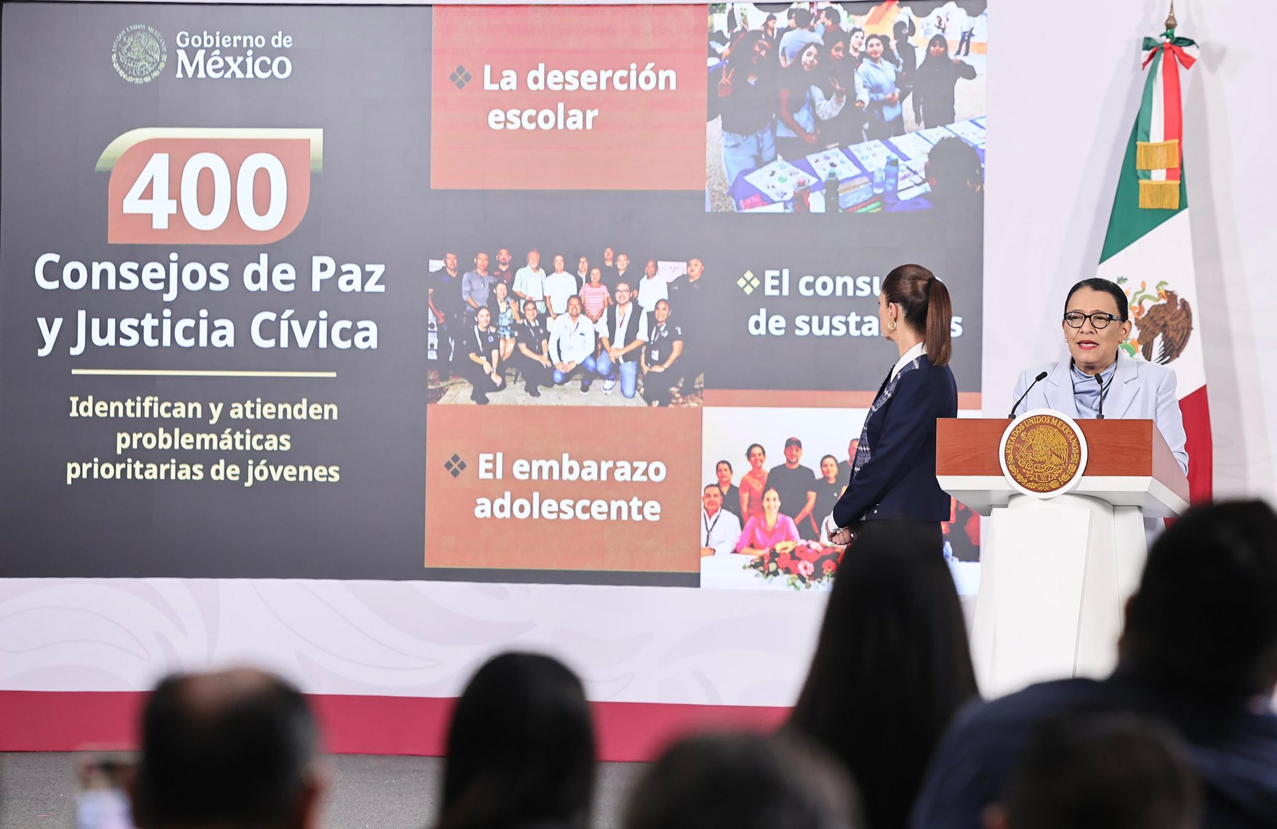 La secretaria de Gobernación, Rosa Icela Rodríguez, presentó los avances del trabajo coordinado de los tres órdenes de gobierno en 61 municipios de 22 entidades del país, detalló que con apoyo del Consejo Mundial de Boxeo se desarrolla el Programa “Boxeando por la Paz”, que cuenta con mil 358 gimnasios, con capacidad para entrenar a más de 53 mil jóvenes.