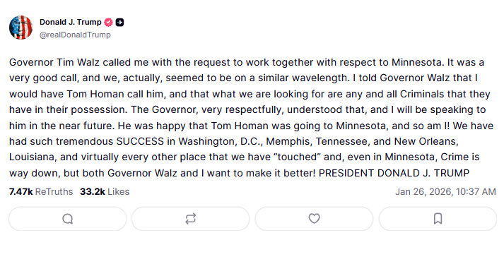 A través de su plataforma Truth Social, el mandatario aseguró que tanto Walz como él están en una “longitud de onda similar” y reafirmó que su objetivo es localizar a “todos los criminales que tienen en su poder”, por lo que contactará al gobernador con Tom Homan, zar fronterizo, para coordinar la estrategia de seguridad.