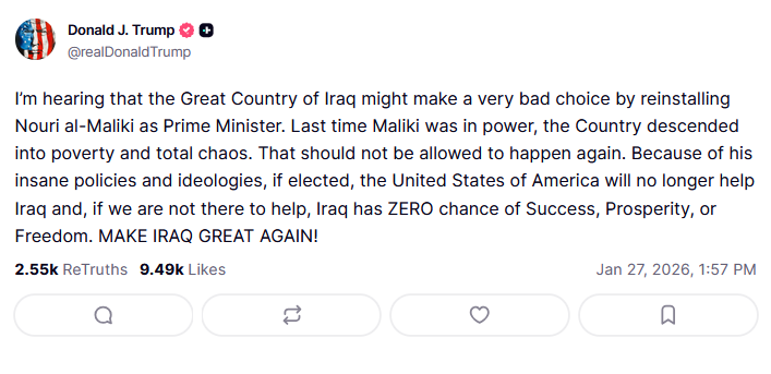 A través de su cuenta de Truth Social, el mandatario resaltó que mientras Maliki estuvo en el poder, el país se enfrentó una gran crisis económica que no debería repetirse.