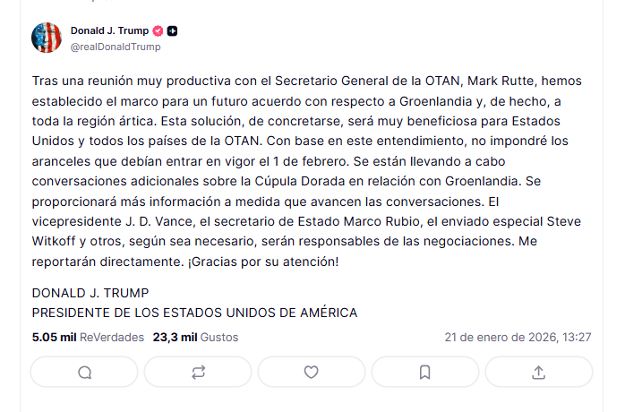 “Tras una reunión muy productiva que he mantenido con el secretario general de la OTAN, hemos establecido el marco de un futuro acuerdo con respecto a Groenlandia y, de hecho, a toda la región ártica (…) Con base en este entendimiento, no impondré los aranceles que debían entrar en vigor el 1 de febrero” escribió en la red social.