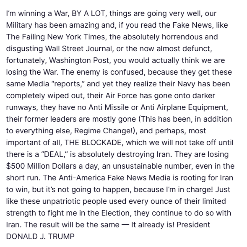 Tensión con los Medios: Nuevamente, Trump acusó a los principales diarios estadounidenses (The New York Times, Wall Street Journal y Washington Post) de difundir noticias falsas que sugieren una derrota estadounidense, afirmando que los medios están «apoyando a Irán» tal como lo hicieron contra él durante la elección. Finalmente, ironizó sobre la crisis energética de Teherán, señalando que el liderazgo iraní está enviando barcos a Texas y Alaska para obtener petróleo.
