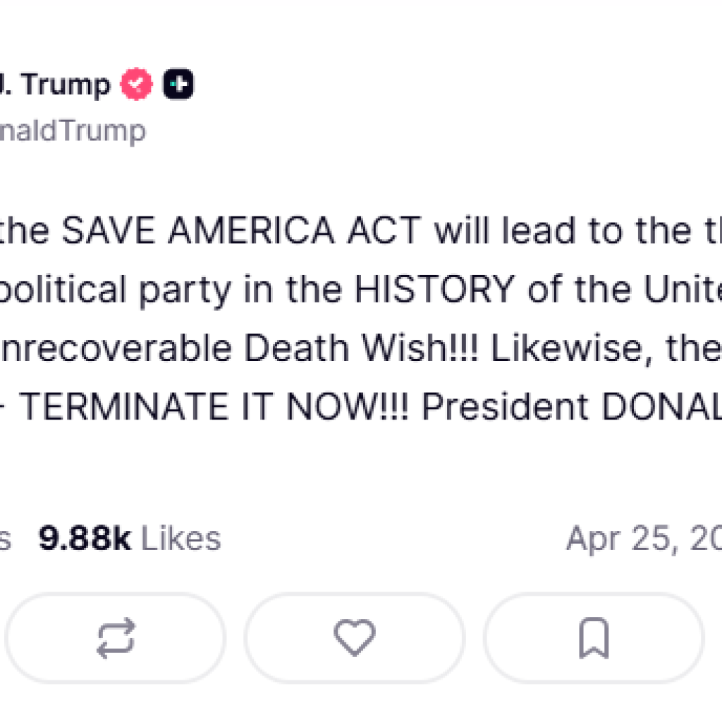 - Save America Act: Trump advirtió a los senadores republicanos que no aprobar la ley conocida como «Save America Act» representará el peor resultado histórico para el partido, calificándolo como un «deseo de muerte irrecuperable».