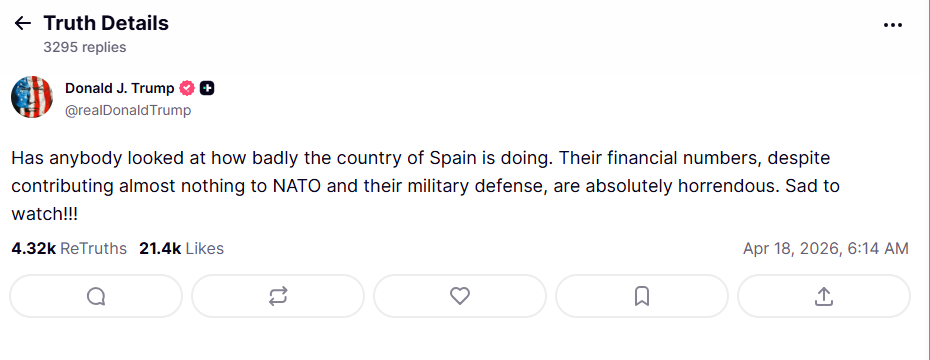 En una nueva embestida contra sus aliados transatlánticos, el presidente Donald Trump publicó un mensaje crítico dirigido al gobierno de España, país que actualmente funge como sede de la IV Cumbre en Defensa de la Democracia. El mandatario cuestionó la salud financiera del país ibérico y su compromiso con la seguridad colectiva de la Alianza Atlántica.
