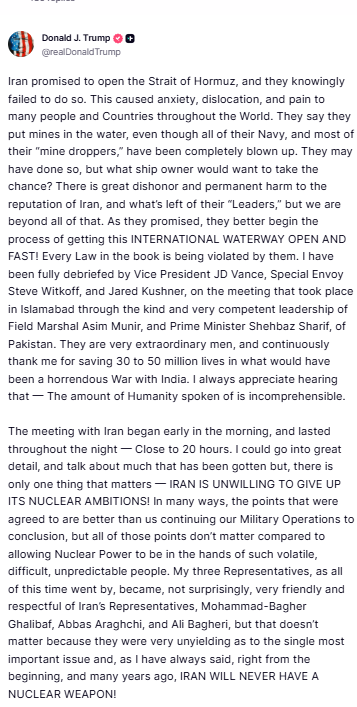Reconocimiento a mediadores y equipo: El presidente informó que fue debidamente informado por el vicepresidente JD Vance, así como por los enviados especiales Steve Witkoff y Jared Kushner. Asimismo, extendió un agradecimiento a los líderes de Pakistán, el Mariscal de Campo Asim Munir y el Primer Ministro Shehbaz Sharif, por su rol mediador.