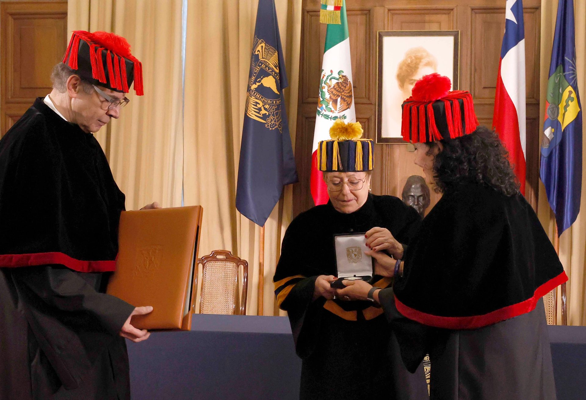 “Michelle Bachelet Jeria recibió de la UNAM el doctorado honoris causa por su liderazgo político, su contribución al empoderamiento de las mujeres en el mundo y su trabajo en favor de los derechos humanos”, destacó la Universidad.